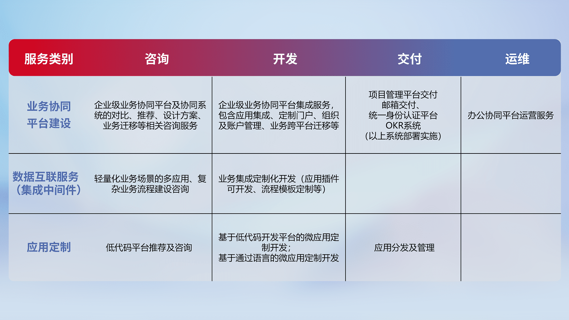针对钉钉、、企微、、IDaas等平台级产品提供产品的规划、、方案、、、、交付、、、、定制化开发等服务,,,实现如统一协同办公、、、智能客户服务、、、混合会议管理、、、智能数据查询、、、等业务场景,,,,实现数字化转型。。。。